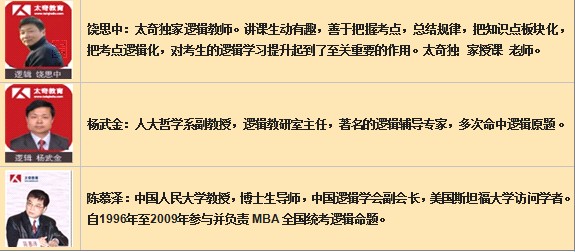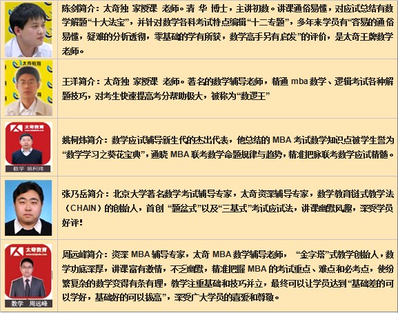 太奇不計成本的狠抓師資質(zhì)量,薈萃了北京乃至全國的最強師資陣容,他們從事MBA教學(xué)多年,有著豐富的教學(xué)經(jīng)驗,有的曾多年參與命題,有的是閱卷組負(fù)責(zé)人,經(jīng)驗豐富,輔導(dǎo)卓有成效,眾所公認(rèn):太奇師資最強,是經(jīng)過實踐檢驗的名師陣容。