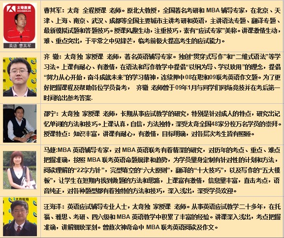 太奇在MBA輔導(dǎo)領(lǐng)域首屈一指的地位,是無數(shù)考生在實踐檢驗中選擇的結(jié)果,優(yōu)秀的學(xué)員選擇了優(yōu)秀的太奇,太奇的成功首先源于學(xué)員的成功,口碑是最好的廣告。正如太奇往屆學(xué)員所說:“太奇如此高的命中率和上線率,使不上太奇成為一種冒險”!太奇2011年MBA聯(lián)考輔導(dǎo),將總結(jié)以往成功經(jīng)驗,進(jìn)一步優(yōu)化師資,加強服務(wù),數(shù)學(xué)輔導(dǎo)新生代領(lǐng)袖陳劍、姚科偉、王洋、張乃岳,著名的英語輔導(dǎo)專 家曹其軍 老師、 邵寧 老師、 齊轍 老師、 馬捷 老師,著名邏輯輔導(dǎo)專家饒思中均為我校獨家全程主講;太奇承諾為每一位學(xué)員提供入學(xué)診斷,建立學(xué)習(xí)檔案,制訂個性化復(fù)習(xí)計劃,助教全程追蹤服務(wù)。同時還將通過太奇俱樂部和中國MBA網(wǎng)提供交流、交友、招聘、求職、創(chuàng)業(yè)、融資等增值服務(wù).